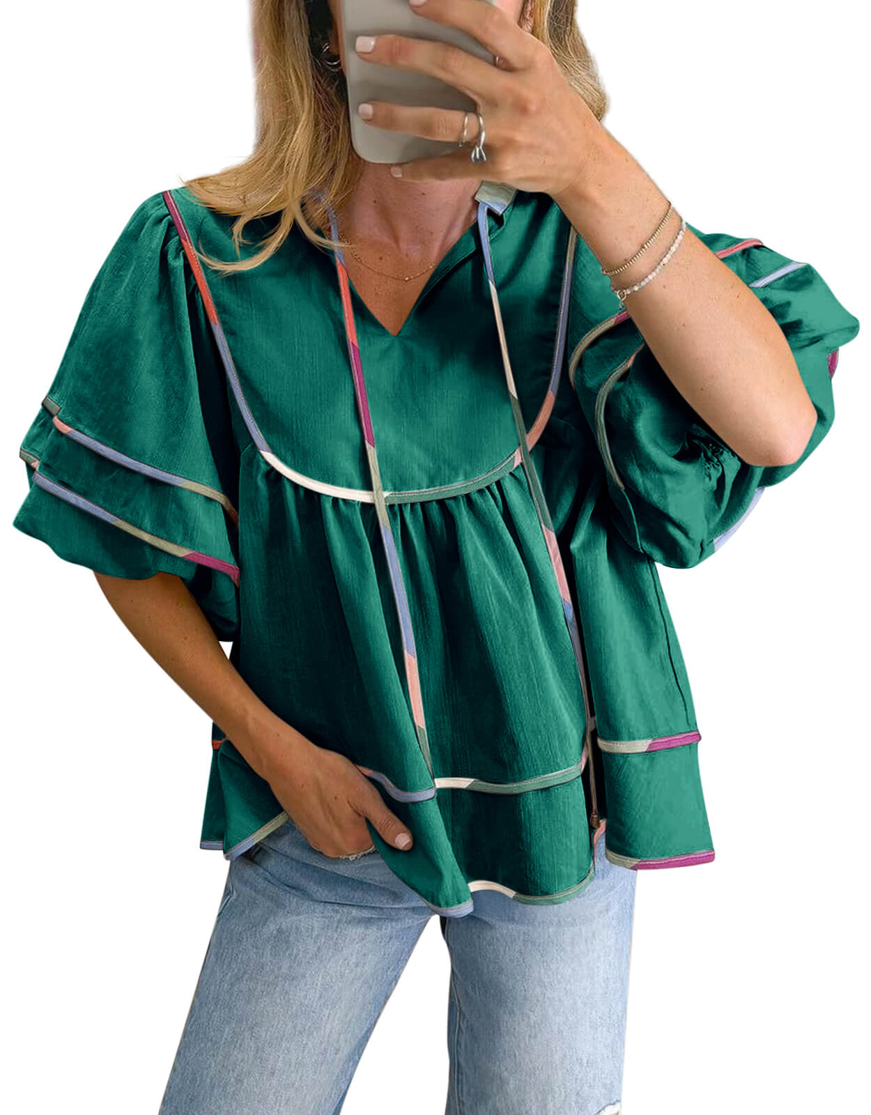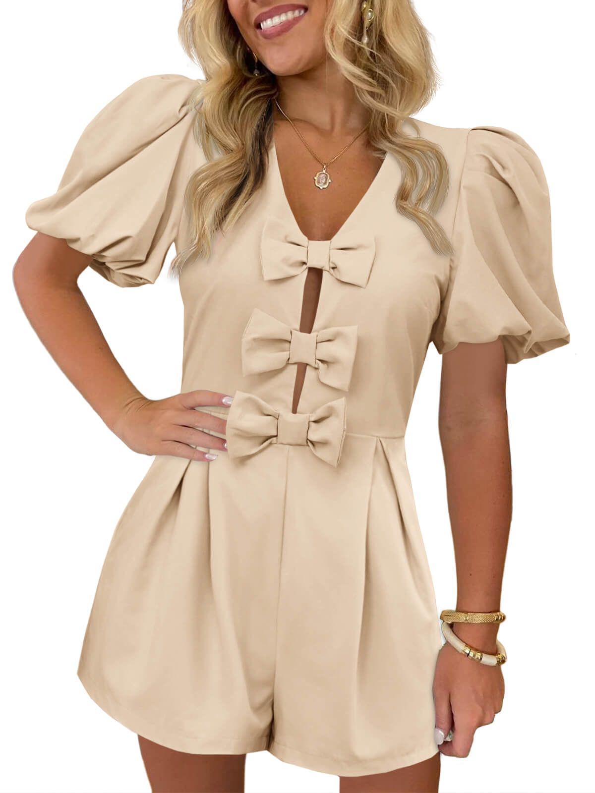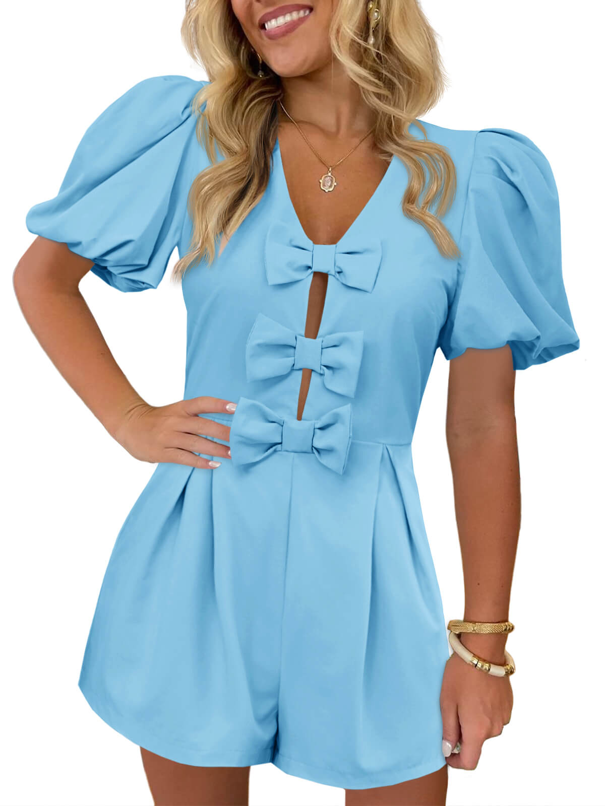 Cicy Bell Womens Cute Rompers Bow Front Puff Sleeve V Neck Short Jumpsuits Sexy Summer Outfits with Pockets